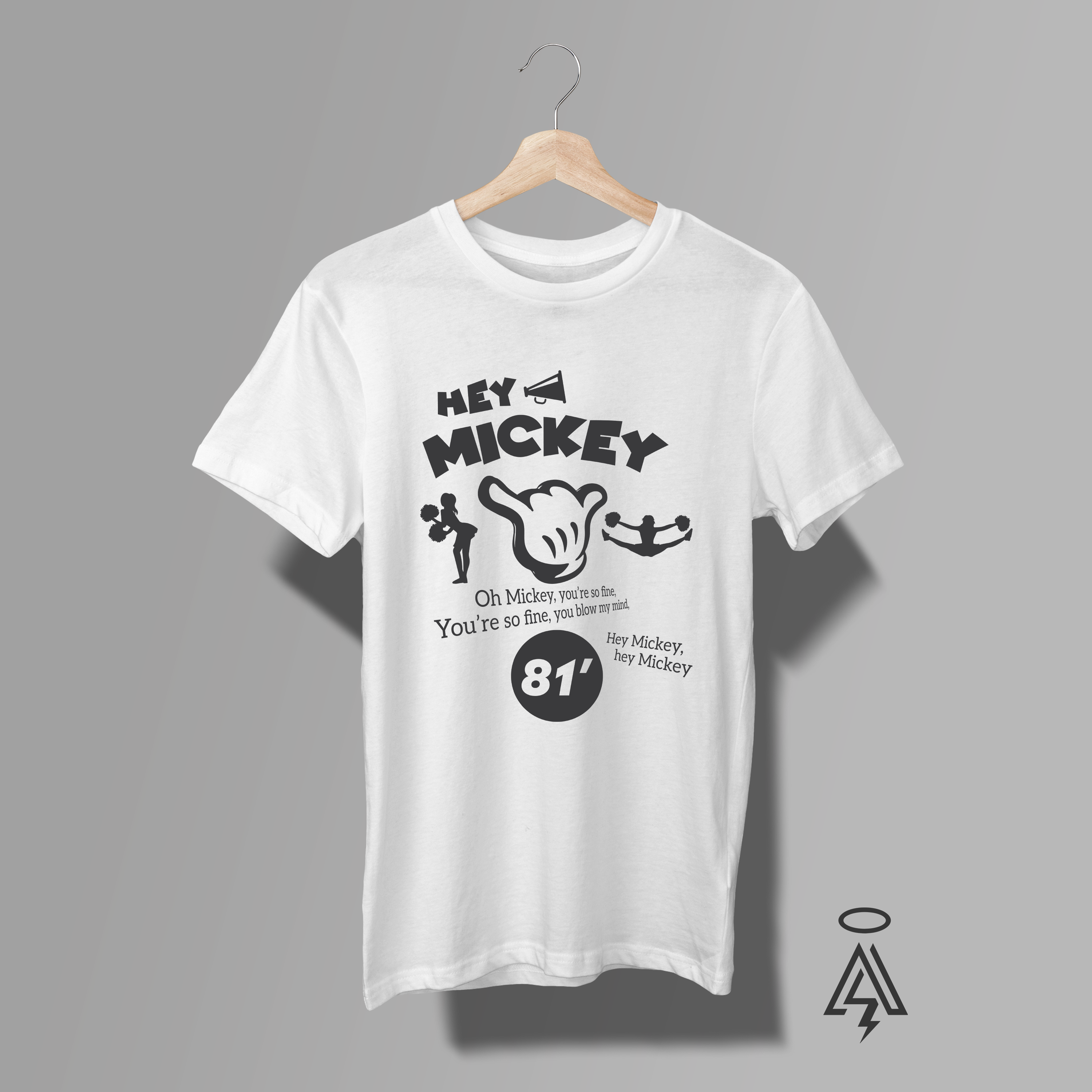 Front and center, the design shouts “HEY MICKEY” in bold, playful typography—instantly recognizable and impossible not to sing in your head. A megaphone graphic kicks things off, while cheer-inspired silhouettes and dynamic visuals capture the infectious spirit of the song that defined a generation.